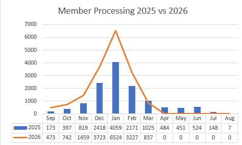 As of 3/16/2026 our membership number for the 2026 membership year are at 92.5% of 2025. Please include your email on your when you renew your membership. We currently have email address for 4,461 active members. This is about 20% of the total membership. As we expand the system, some functions will depend upon email communications. Please collect and enter our member's email address. Click here to view the current membership summary. The graph below shows when our membership comes in by month, comparing 2025 to 2026.