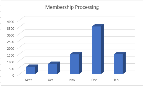 As of 1/7/2026 our membership number for the 2026 membership year are at 52% of 2025. Please include your email on your when you renew your membership. We currently have email address for about 23% of the total membership. As we expand the system, some functions will depend upon email communications. Please collect and enter our member's email address. Click here to view the current membership summary. The graph below shows when our membership comes in by month.